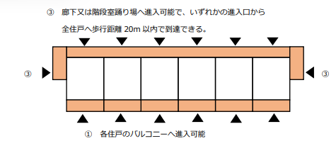 ①各住戸に道又は道に通じる幅員4m以上の通路その他の空地から進入可能なバルコニーを設けること。(隔て板での横移動は不可)